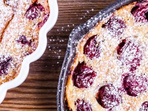 A clafoutis is a baked French dessert featuring a rich batter over fruit. Cherries are the traditional fruit used in a clafoutis, but other soft fruits, such as peaches, plums, or apricots work well too. This melt-in-the mouth pudding might soon become your favourite summer pud! Why not pick up some Bennetts Vanilla Ice Cream...
