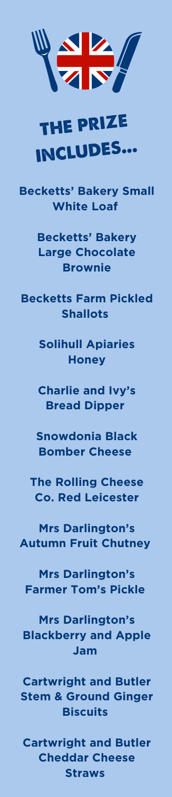To celebrate this fantastic fortnight, we’re giving away the ingredients to create a delicious family meal for four this British Food Fortnight. This British hamper includes freshly baked bread, cake, cheese, chutneys, jam and more! Packed full of our favourite British products, it’s not to be missed! Fill out the form below to enter. The winner will be chosen on Monday 13th October 2025.